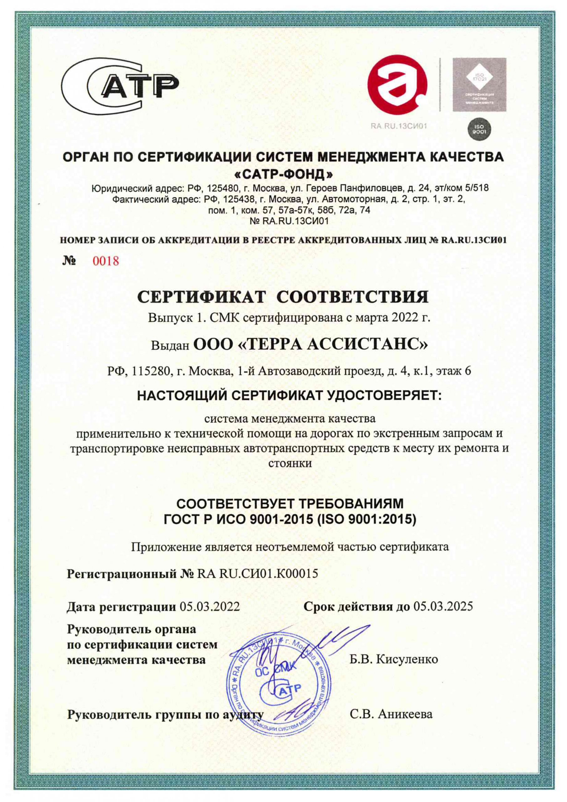Лидерство, стремление к улучшению, процессный подход – принципы, которыми руководствуется Терра Ассистанс. Теперь мы получили сертификат ГОСТ Р ИСО 9001-2015 и официально подтвердили соответствие установленным в РФ стандартам системы менеджмента качества. Её применение – уверенный шаг к укреплению основы для инициатив, ориентированных на устойчивое развитие компании.